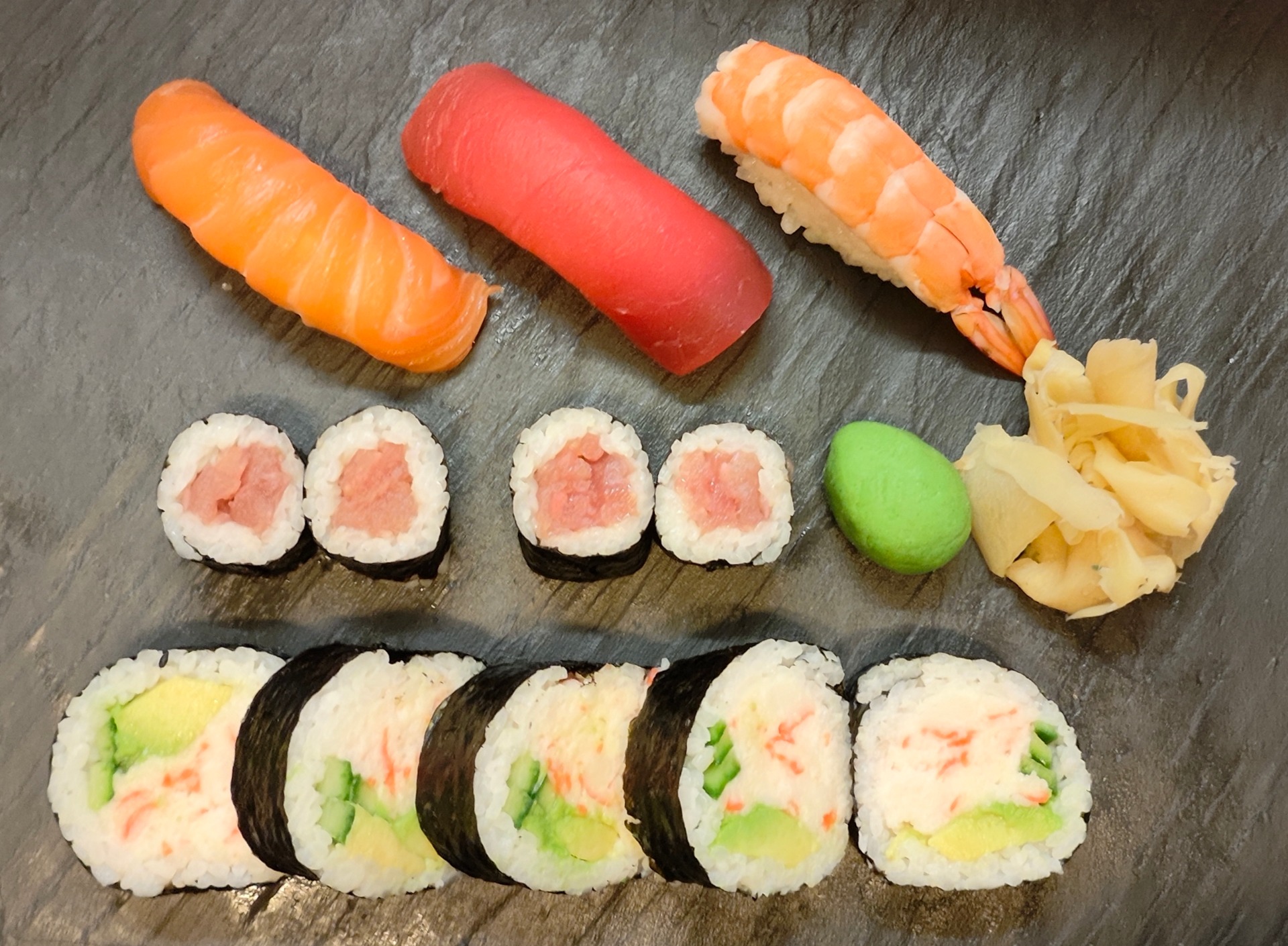 3 stk. Nigiri: 1 stk. Laks, 1 stk. Tigerreje , 1 stk. Tun4 stk. Hosomaki: 4 stk. Tun5 stk. Futomaki: 5 stk. California