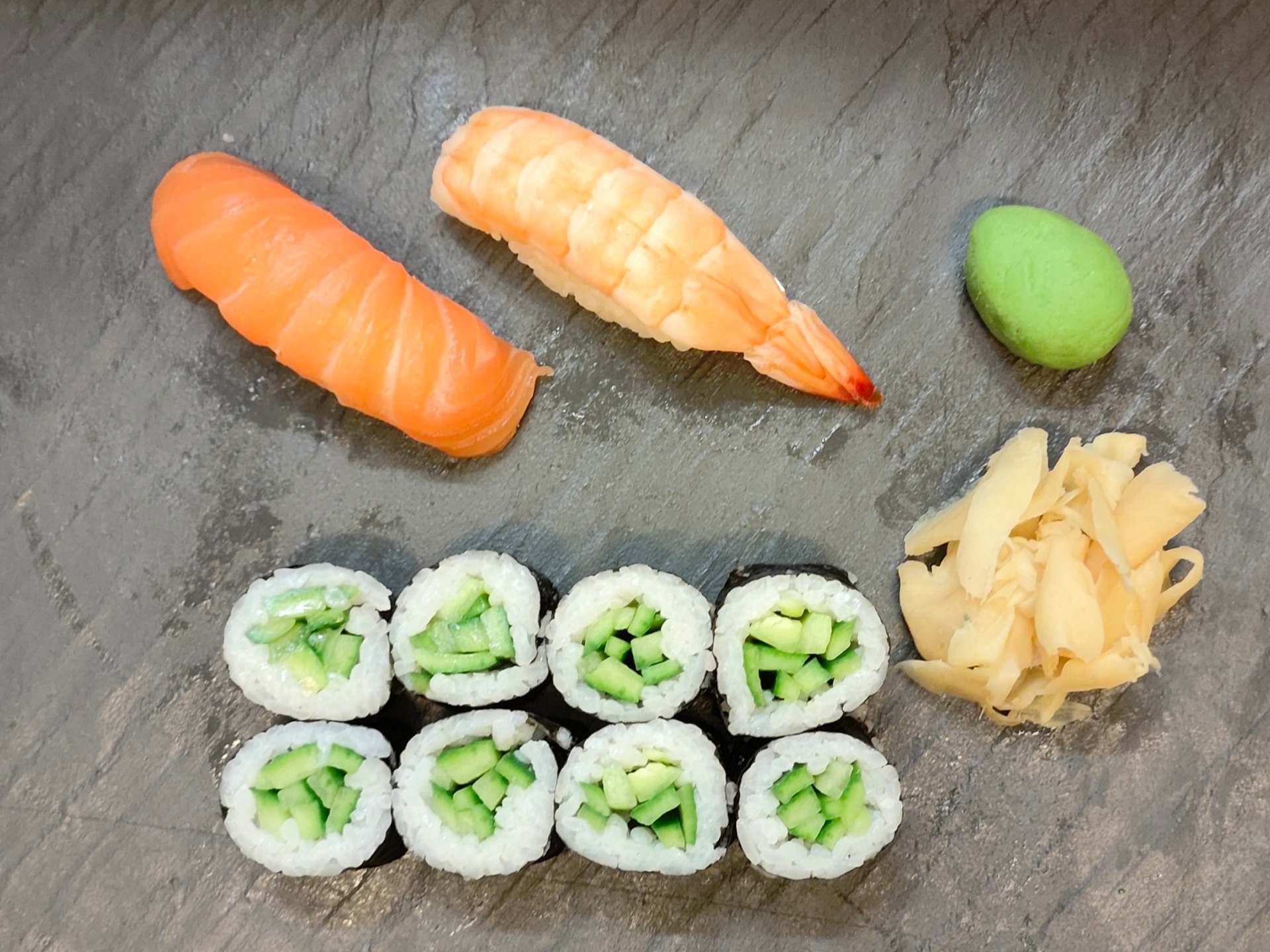 2 stk. Nigiri: 1 stk. Laks, 1 stk. Tigerreje8 stk. Hosomaki: 8 stk. Agurk