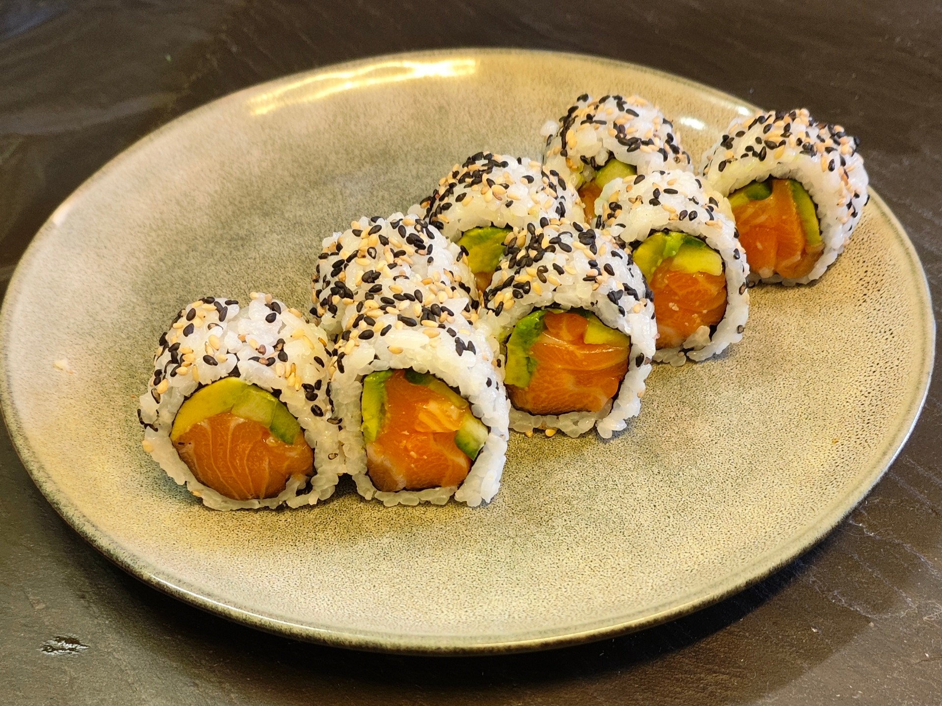 8 stk. Laks med avocado, agurk og chilimayo, rullet i sesamfrø