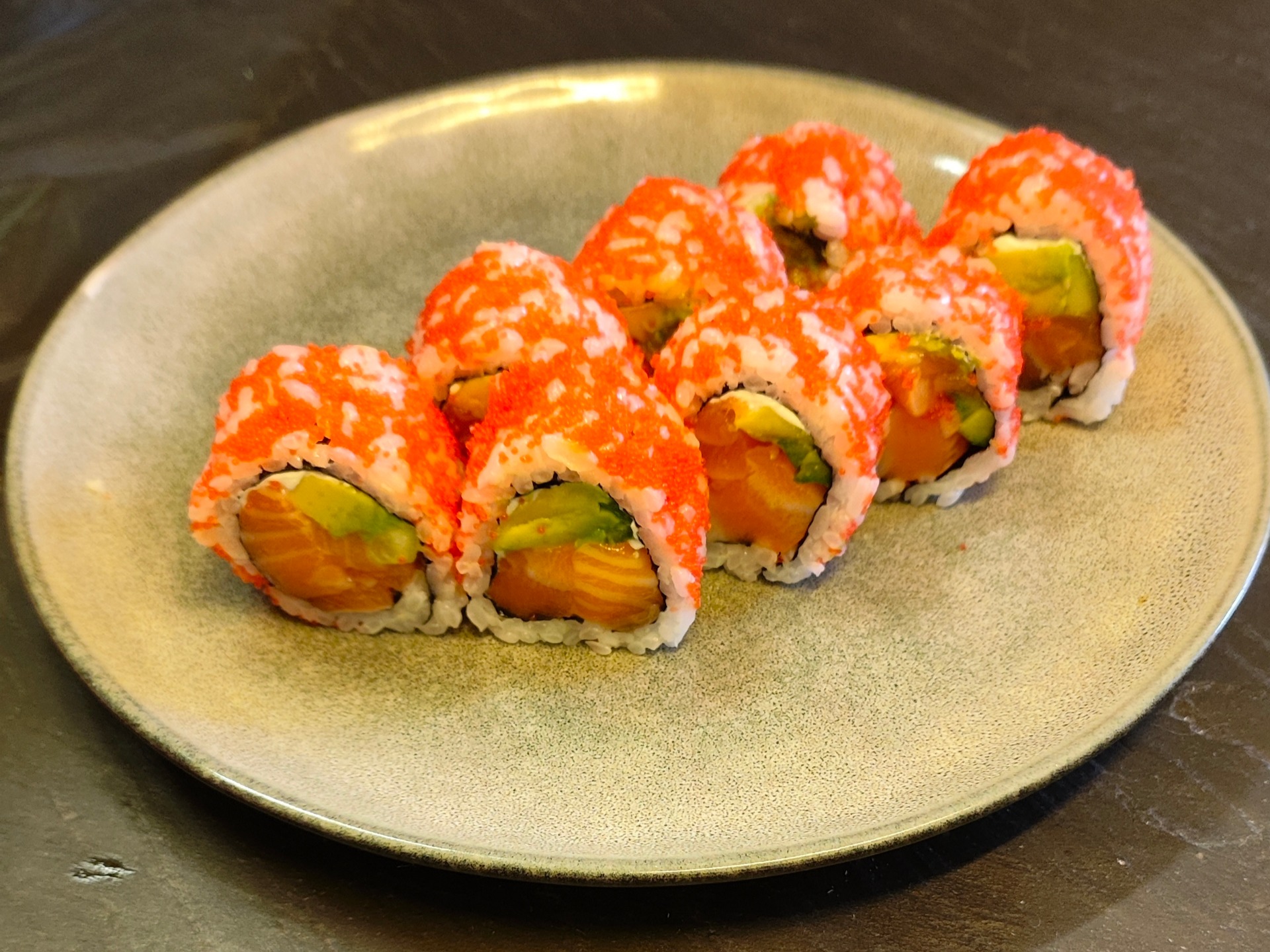 8 stk. Laks med flødeost, avocado og agurk, rullet i masago