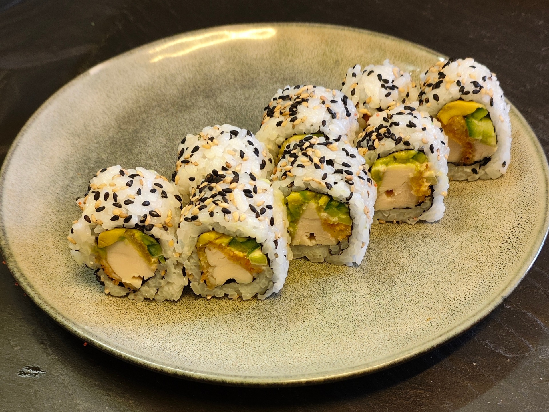 8 stk. Dybstegt paneret kylling med avocado, agurk og chilimayo, rullet i sesamfrø