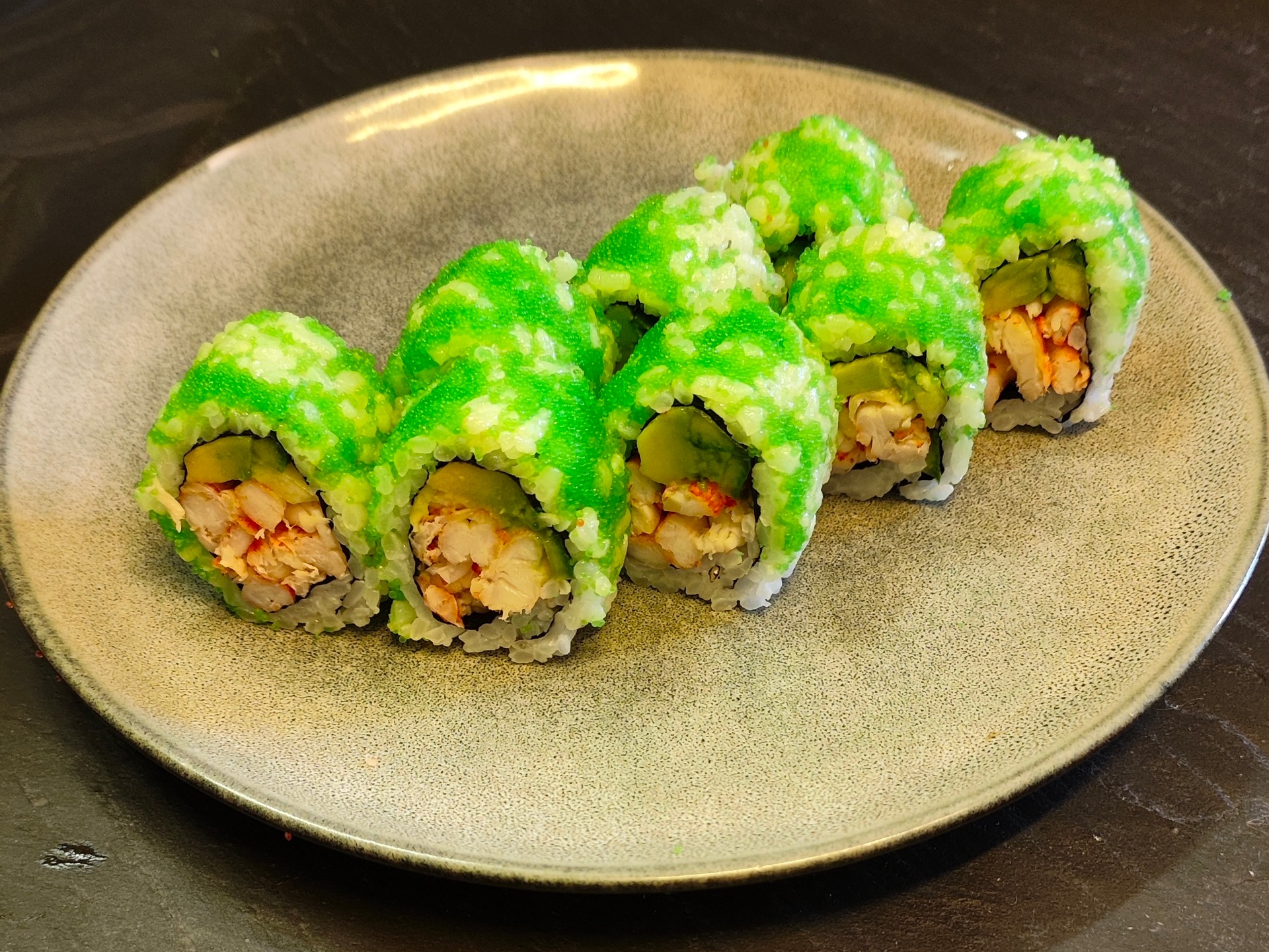 8 stk. rejer med avocado og agurk, rullet i wasabi tobiko